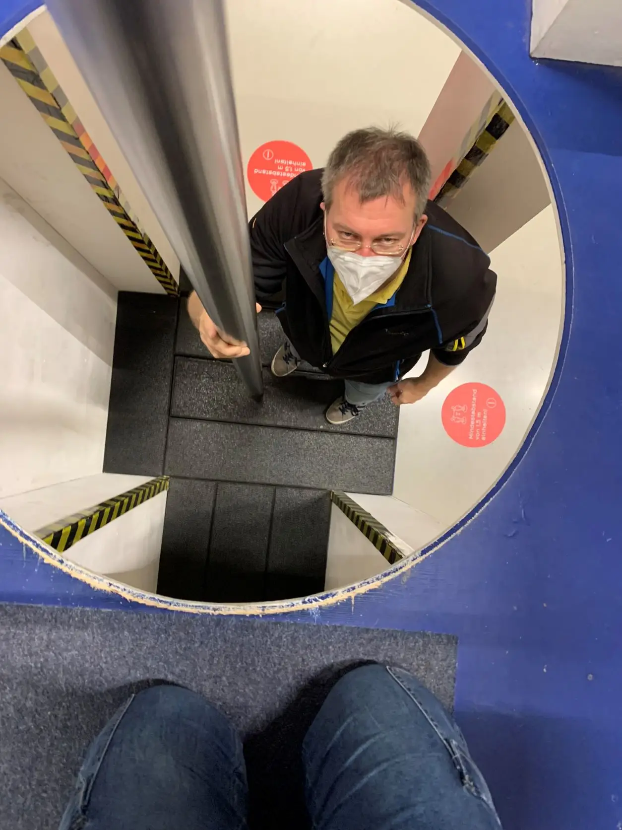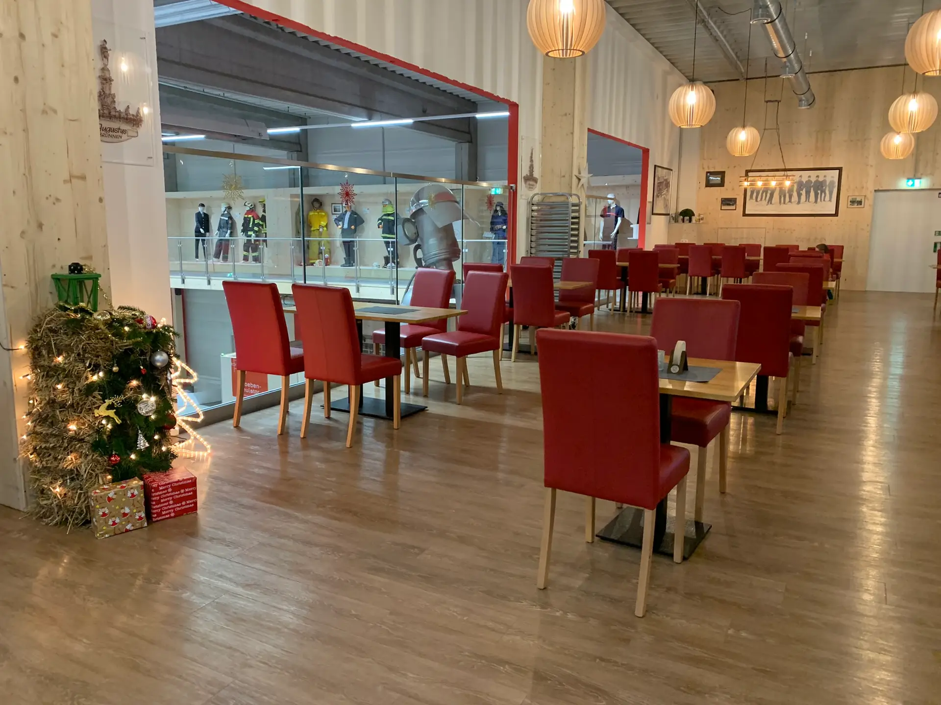 Wissen macht hungrig, Experimentieren sowieso. Bevor es weitergeht, mit dem Feuerlöscher Flammen zu löschen, fahren wir mit dem Aufzug hoch ins Bistro (Stichwort Buggy). Das Bistro ist derzeit weihnachtlich geschmückt. Aus den bodentiefen Fenstern sehen wir den Menschen unten beim Entdecken zu und lassen uns das Essen schmecken. Wir konnten sogar noch in Ruhe Kaffee trinken – die Aussicht hält die Kinder wirklich beschäftigt.