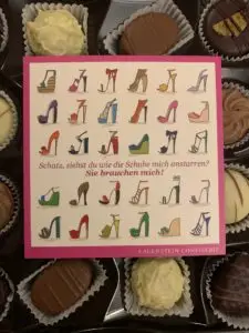 Die Woche war überhaupt total reich an irgendwelchen Bringern. Päckchenlieferung. „Vor Wärme schützen“. 25 Grad im Schatten. „CONFISIERIE“. Päckchen liegt in praller Sonne draußen. Seufz.