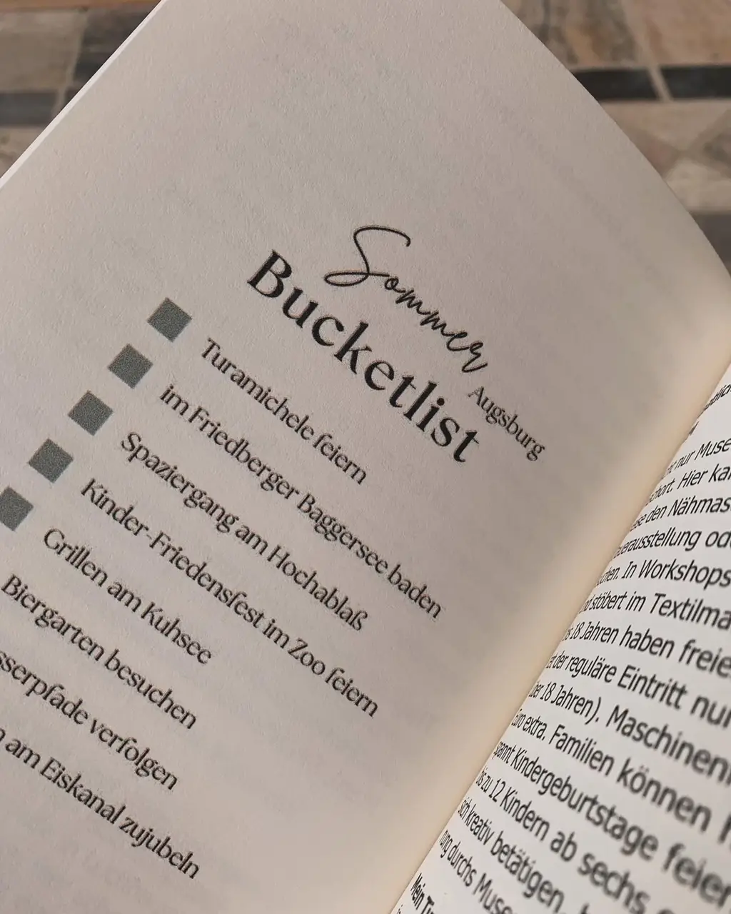 Natürlich gibt es ganz viele Extras im Buch: Tipps für technikbegeisterte Kinder, die Augsburger Feiertage auf einen Blick, Platz für Notizen, eine Bucketlist und noch einige andere Überraschungen. Für viele Ausflugstipps gibt es auch meine persönlichen Tipps und Highlights und Möglichkeiten, Ziele zu kombinieren.