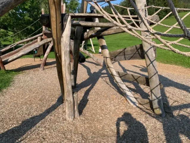 Wir biegen nach links ab, zum „Hasengarten“. Hier am Naturspielplatz legen wir eine wohlverdiente Pause ein: Klettermöglichkeiten, Rutschen, Nestschaukel, Buddelplatz und Dammbau im Bach – wir müssen aufpassen, dass wir rechtzeitig wieder weg kommen – es ist schon spät. Zum Abschied bimmeln die Kuhglocken, die Kinder winken den Bauern auf den Traktoren zu.
