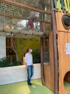 Der Indoorspielplatz hat eine separate Ecke für ganz kleine Kinder, Vorschulkinder und ältere Kinder toben über den großen Spielplatz. Da geht es hoch in luftige Höhen! Die Spielplätze draußen sind auch toll, trotz Schnee haben wir viel Zeit draußen verbracht. Der Bauernhof hat einen kleinen Streichelzoo mit Ziegen und Schafen, die Ponys sind zum Reiten da. Das tollste Erlebnis ist aber wohl wirklich der große Indoor-Teich mit Koi-Karpfen. Hier verbrachten unsere Kinder wohl die meiste Zeit.
