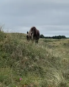 Der Campingplatz liegt direkt am Strand. Oberhalb führt ein Radweg am Meer entlang, sehr hübsch. In einiger Entfernung gibt es ein bewaldetes Gebiet mit Wildpferden. Hier darf man durchradeln oder geht wandern. Eine märchenhafte Landschaft, ca. 15 Minuten vom Campingplatz entfernt. Wirklich eine schöner Stellplatz, wenn man erst abends mit der Fähre von Deutschland her anreist!